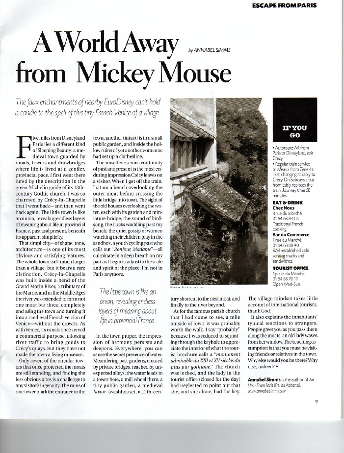 Un article sur Crécy est paru dans le numéro de mars de France Today. (site du journal en cliquant sur le logo). Ce magazine américain se présente comme le journal de la culture française et du tourisme en France. L’article intitulé "A world away from Mickey Mouse" (un monde bien loin de Mickey) nous offre une visite de Crécy vue par un étranger.