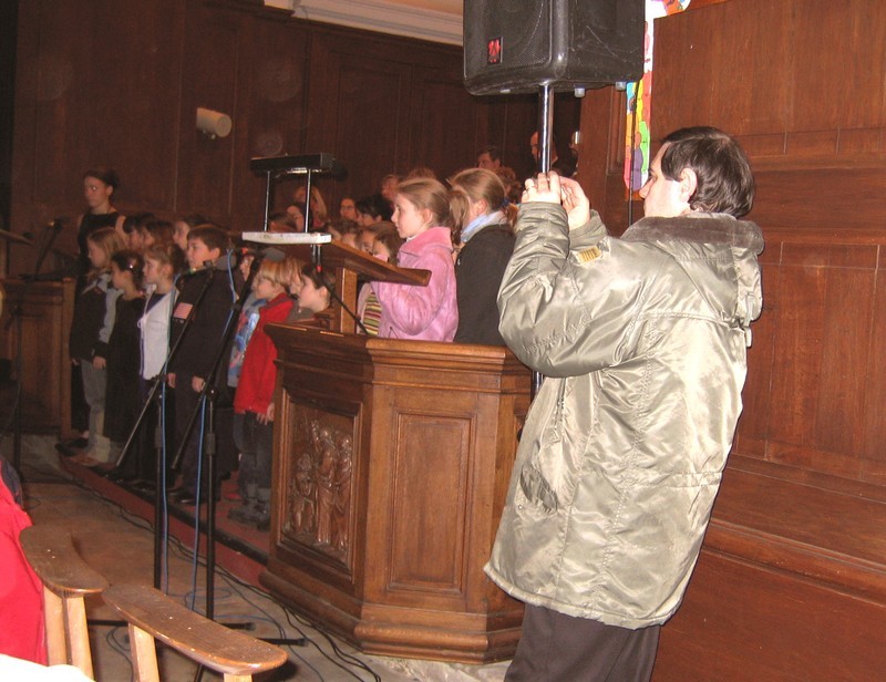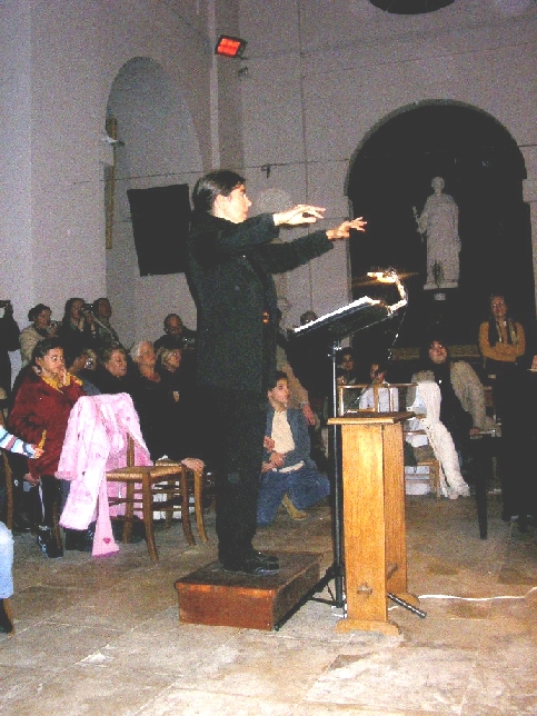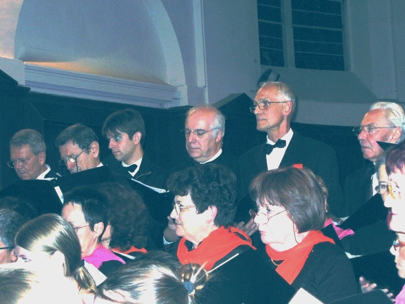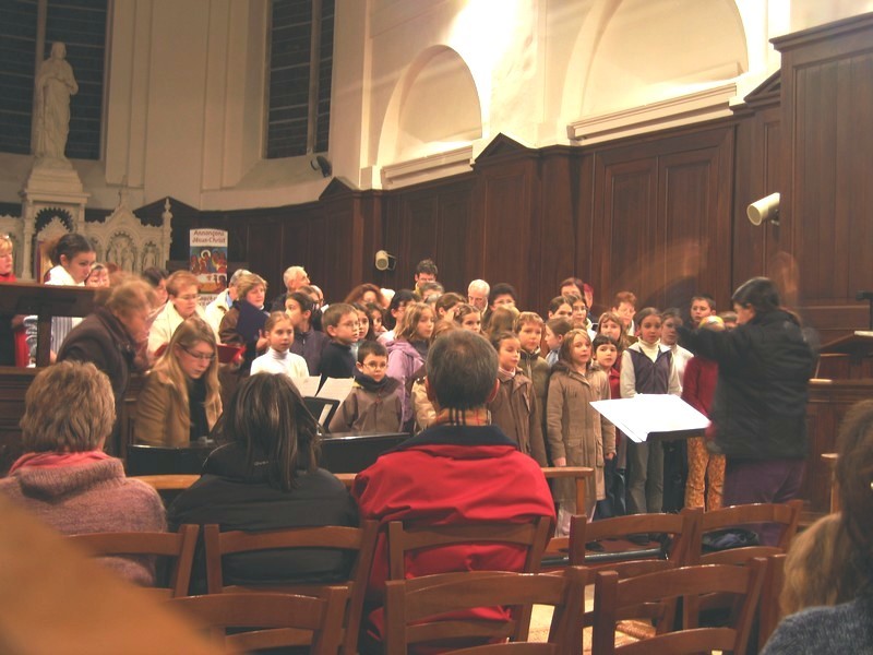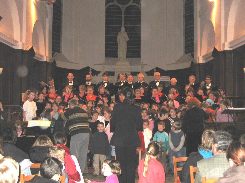 L’église St Georges de Crécy était comble à 20H30 pour le concert de clôture du téléthon créçois 2005. Dans une première partie les élèves de l’Ecole de Musique de Pays Créçois et le Petit Choeur du Grand Morin ont usé de leurs talents respectifs et complémentaires pour interpréter plusieurs morceaux en commun. Deux extraits du film "les choristes" ont bien sûr enthousiasmé l’assistance composée de nombreux parents et amis.