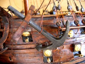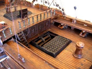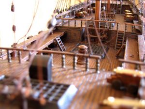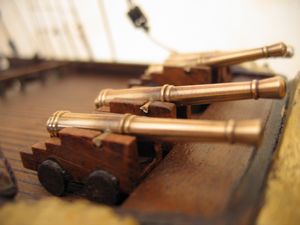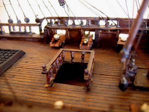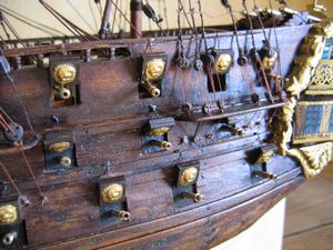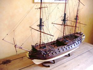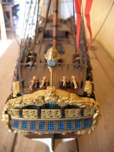 Il semble que nos maquettes soient basées sur le même kit de modélisme car les accessoires ( figure de poue, sabords, lanterne) en pur plastique années 60,sont les mêmes. Une bizareté sur votre maquette : les canons de retraite n’étaient pas sur le gaillard arrière où leur poids en hauteur aurait été dangereux pour la stabilité du navire. Ces canons étaient deux, placés sous le tableau arrière. Mais votre maquette est très belle.