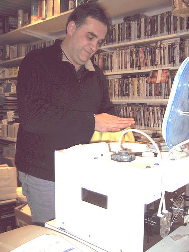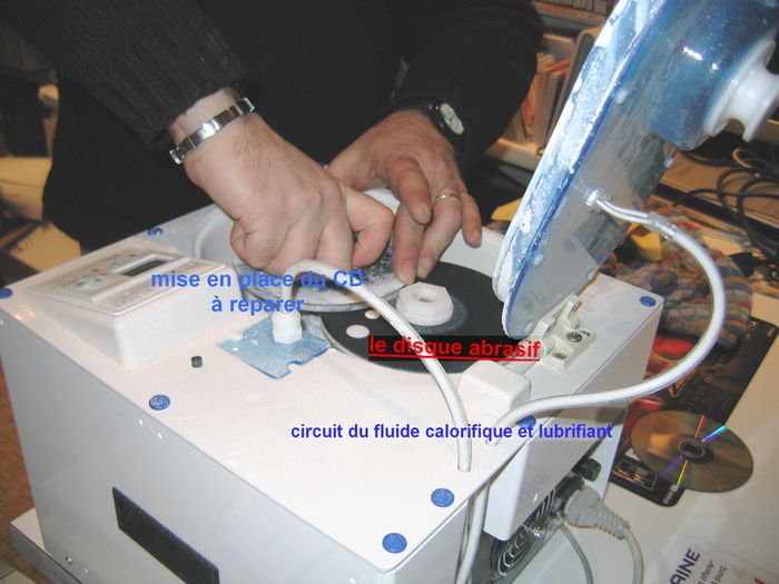 En passant par le cyber, mon attention a été attirée par une curieuse machine installée sur le comptoir de location de DVD (hasard ?). Je l’ai d’abord confondu avec une machine à laver, de voyage. Le lutin de jms m’avait-il soudain entraîné dans les couloirs du temps, à l’époque du "Pressing de la Halle" * ? Non, cette machine miraculeuse est celle que Bruno, le Maître d’échoppe (photo ci-contre), utilise pour rendre aux CDs, une nouvelle jeunesse.