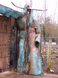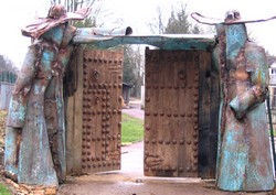 Ces deux statues métalliques sont impressionnantes par leur taille et un peu inquiétantes. J’ai même eu peur un instant que le flash de l’appareil ne les mette de mauvaise humeur. D’où viennent ces deux longs manteaux : du old far-west, d’Espagne, de Camargue, d’une autre planète … ? Avec des objets aussi pittoresques, je ne serais pas étonné de voir le petit chemin de Villiers à Crécy devenir un lieu de promenade dominicale très prisé des créçois et voulangeois, dès les premiers jours du printemps. Il n’en reste pas moins que la palissade en bois brut n’est pas une réussite totale à mon goût. Le portail principal, en particulier, est un peu chargé, un peu trop visible et pas franchement joli. jna |