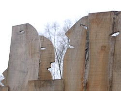 Plusieurs pans de cette palissade, constitués d’avivés de bois à peine équarris, présentent à leur sommet des décors très originaux. En effet, les planches dressées ont été travaillées à leur extrêmités pour figurer tantôt des profils aux allures de totems , tantôt des silhouettes de matous, elles aussi joliment expressives et toutes différentes les unes des autres. Celui qui a réalisé ces figures possède de toute évidence un talent certain. Je n’étais pas au bout de mes surprises. En allant à la rencontre des matous, armé de mon seul appareil photo, je me suis retrouvé confronté à deux curieux personnages. Une autre excentricité du clown, mais une véritable oeuvre d’art dressée au seuil du portail ouest de la propriété. |