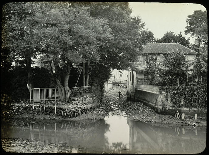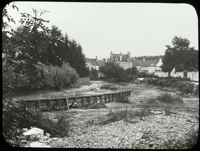 Je pense que c’est en aval du moulin, pris au pied du moulin. je suis allé vérifier sur place avec la photo et je suis de plus en plus septique. Le mur à droite est très loin, une haie le cache d’ailleurs. Entre le mur et le bosquet de gauche il y a 50 mètres de largeur sur le terrain alors que sur la photo ils ont l’air si proche. Les maisons au loin ne correspondent pas tout à fait ou aors elles ont bien changé. Il est bien vrai que le pont d’am’Gilles est invisible de là car situé derrière le bosquet. Le lit de la rivière aurait-t-il changé, en s’élargissant ? en fait il faudrait se placer en plein centre de la rivière pour mieux vérifier la configuration