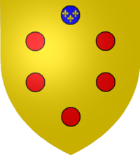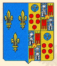 Les deux figures qui suivent représentent deux "versions" des armoiries de Catherine de Médicis. Le blason de gauche est complexe, car il fait référence aux familles des deux parents de la Dame : Laurent II de Médicis (un florentin) et de Madeleine de la Tour d’Auvergne (une française). Celui de droite correspond au blason de la famille des Médicis, surchargé de fleurs de lys, pour indiquer la qualité de reine de France.