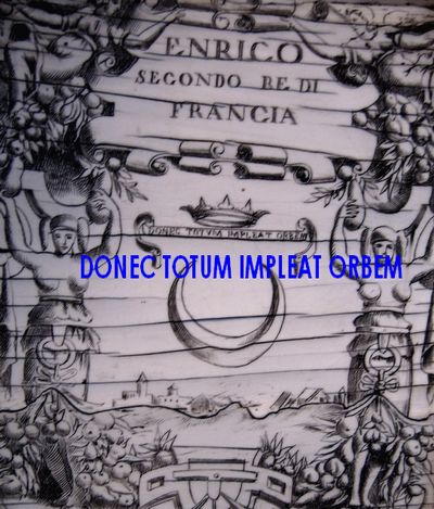 Le texte complet : " Henri II Roi de France " et au-dessus du croissant de lune, la devise du Roi : Donec totum impleat orbem"