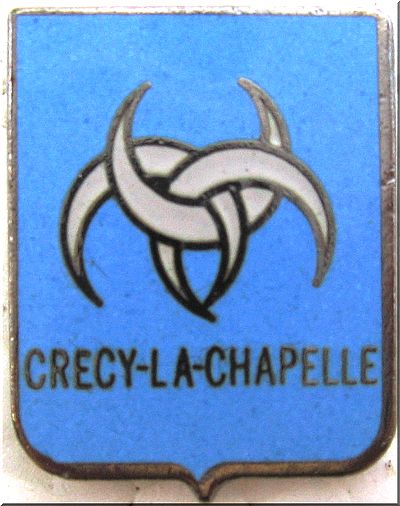 A gauche : le blason de Crécy-la-Chapelle, en version pin’s, des années 90 |