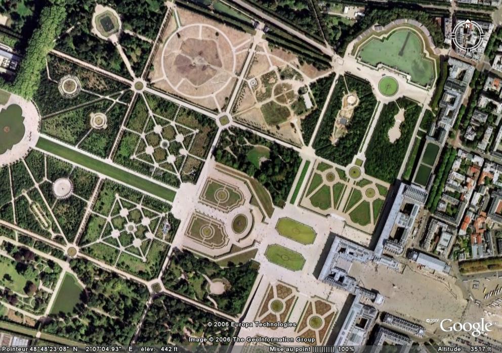 Si vous regardez bien,vous retrouverez un Mickey de face en prenant le bassin de Latonne comme nez, le muret situé sur la droite sur la photo formant la bouche souriante, les parterres de Latonne 2 grands yeux ouverts, les quinconces du Nord et du Midi formant une paire d’oreilles.