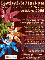 Le premier concert a lieu dimanche 1er octobre au chateau de Ferrières. Hélas, c’est complet depuis longtemps mais il n’est sûrement pas trop tard pour réserver pour les autres concerts. Les 17 et 18 novembre à Pontcarré, ce sera le week-end du rire avec plateau d’humoristes et pièces de théâtre. La brie boisée c’est à nos portes, alors n’hésitons pas à franchir la forêt de Crécy qui nous en sépare. Programme complet dans la suite de l’article et sur le : site de la brie boisée Réservations : 01.64.66.94.17 email : festival@brieboiseefr |