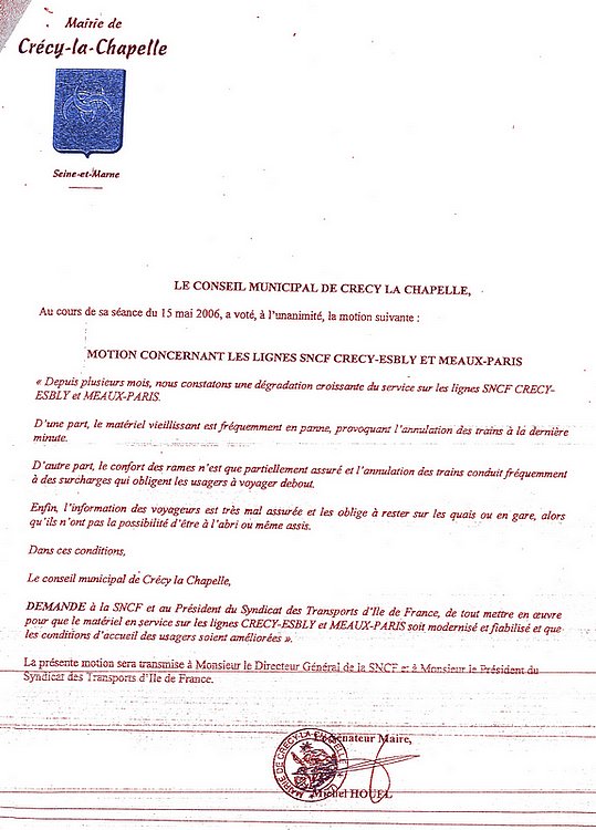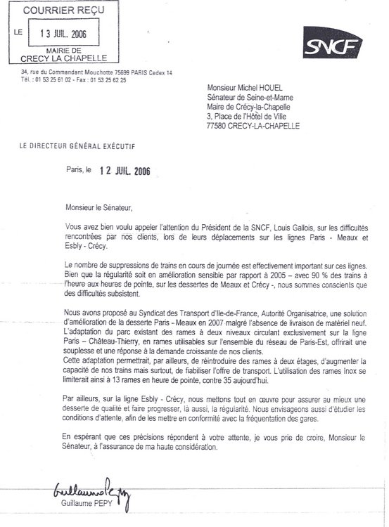 Que retenir de cette réponse. Tout d’abord, l’accent est mis sur la belle performance de la SNCF : 90% de régularité pour nos trains aux heures de pointe. Pourquoi se plaindre après ça ? Cette statistique me laisse perplexe. Nous ne partageons pas la même définition de la régularité, semble-t-il. Pour être honnête, je dois reconnaître que la ponctualité de la navette Crécy-Esbly s’est nettement améliorée au-cours du second trimestre 2006. Entre les lignes (de la lettre), on nous explique aussi que c’est l’Autorité organisatrice qui est à l’origine de nos maux : le Syndicat des Transports d’Ile-de-France. Non seulement il nous a refilé plein de petits gris en 2006, mais en plus, il n’a pas prévu de matériel neuf pour nous, en 2007. Il faut faire avec.  Je retiens aussi, la volonté de mieux faire de la part de la SNCF, mais sans trop savoir comment s’y prendre.