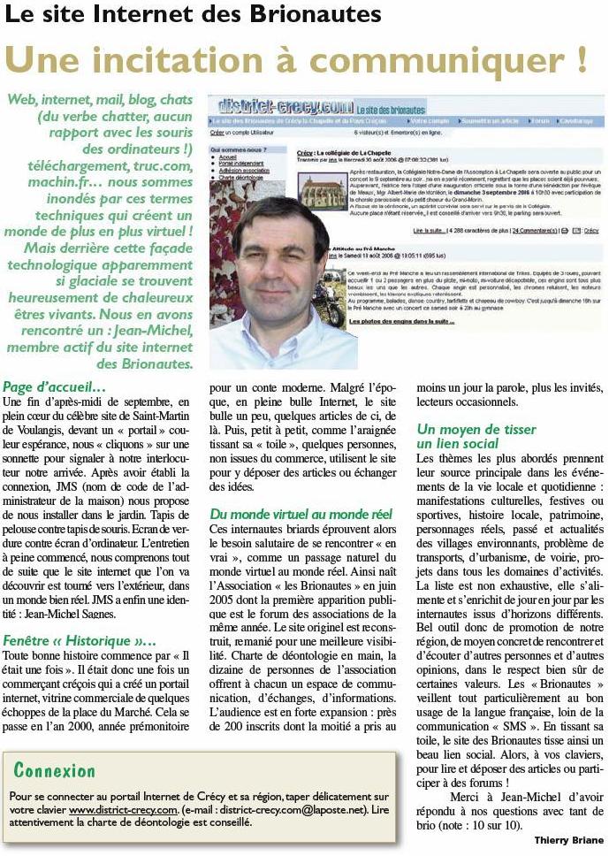 En vis-à-vis d’un excellent article consacré à un Voulangeois célèbre Edward Steichen, une page est dédiée au site internet des brionautes avec ce titre très évocateur "une incitation à communiquer !".