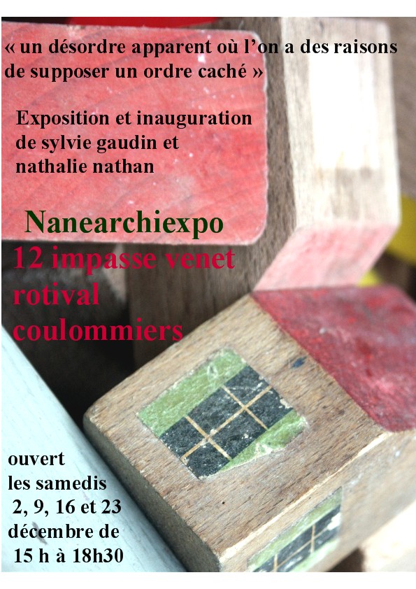 |  | Exposition insolite à Coulommiers les samedis 2, 9, 16 et 23 décembre de 15h à 18h30 Le thème laisse songeur : "Un désordre apparent où l’on a des raisons de supposer un ordre caché" Adresse : 12 impasse Venet-Rotival Coulommiers. (merci à Christian de Familles Rurales pour l’affiche) L’affiche de l’expo et un plan d’accès dans la suite … |