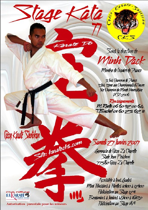 | Le club CKS (Crecy Karate Shokoban) organise un stage de karaté le samedi 27 janvier 2007 au gymnase de Crécy. Sous la direction de MINH DACK membre de l’équipe de France. Accessible à tous les niveaux : – mini-poussins à pupilles de 10h à 12h, participation 12 euros – benjamins à juniors : 14h à 16h30, participation 18 Euros Contacts : Th. Buchel 01.60.25.62.11 – M. Ruelle 06.60.92.00.64 site : www.katatecks.com – Inscription : http://www.karatecks.com/inscrip0506.htm |