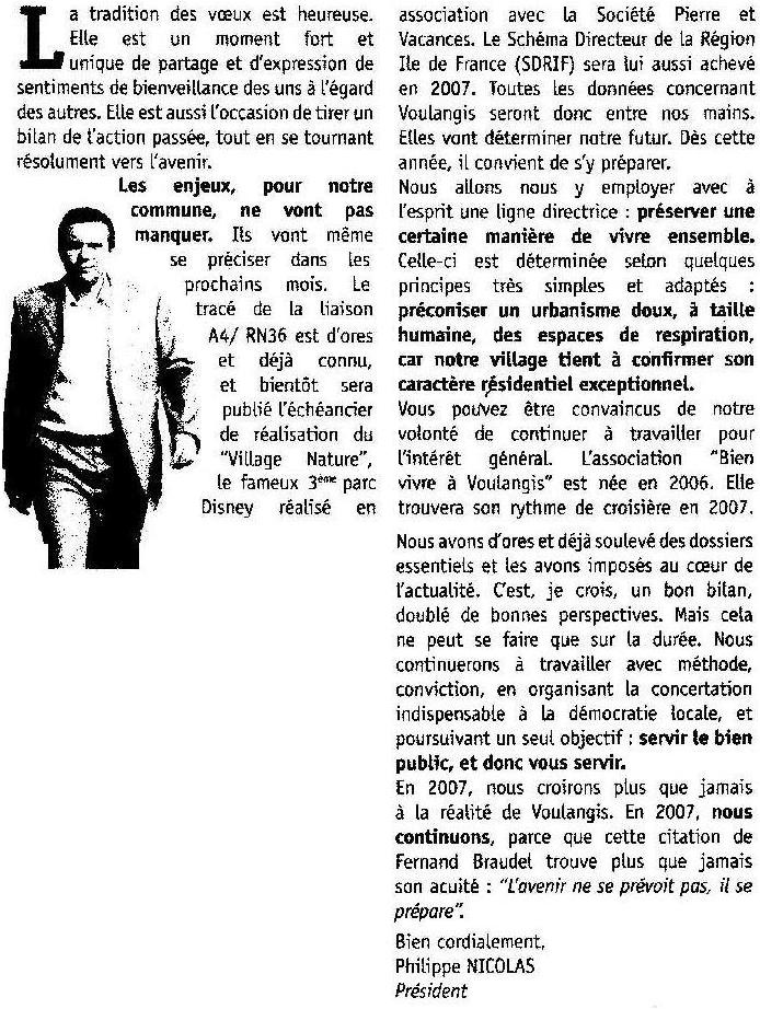 Le numéro 3 du bulletin de l’association "Bien Vivre à Voulangis" vient d’être distribué dans les boites aux lettres des voulangeois. L’éditorial souhaite une bonne année 2007 aux voulangeois, année qui risque de voir la concrétisation de projets par forcément positifs.