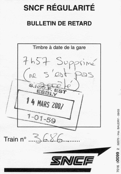 En effet, contrairement à notre engagement régularité sur le réseau Grandes Lignes, aucune compensation n’est prévue sur le réseau Transilien en cas de retard ou de suppression de train. (En revanche un contrat est passé avec le Syndicat des Transports d’Ile de France.(autorité qui organise les transports dans notre région, chapeauté par la région) Cordialement. BULLETIN DE RETARD Mercredi 13 mars : le train de 7H57 se présente en gare d’Esbly à l’heure (tant mieux, le précedent a été annulé), mais il passe devant le quai à toute allure sans chercher à s’arrêter. Ce n’est que bien plus loin qu’on l’aperçoit essayant de ralentir. Trop tard, il a dépassé le quai de plusieurs centaines de mètres. Raison invoquée à la gare d’Esbly : un problème d’enrayage. En d’autres termes, le conducteur a essayé de freiner mais les freins n’ont pas répondu. Enrayage peut-être, mais si le conducteur a essayé de freiner brutalement, ce n’est qu’après s’être aperçu de son erreur.¨