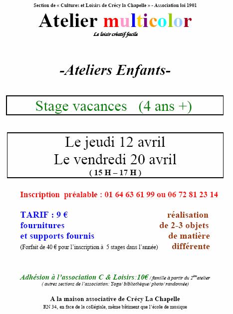 L’atelier MULTICOLOR propose des stages de loisir créatif pour enfants pendant les vacances de printemps. Les jeudi 12 et vendredi 20 avril 2007 De 15h à 17 h Inscription : 01.64.63.61.99 ou 06.72.81.23.14 – tarif 9 Euros Maison associative de Crécy à La Chapelle face à la collégiale