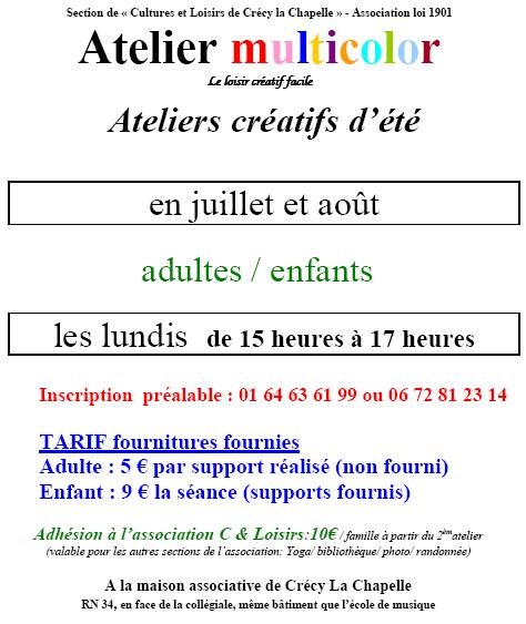 L’atelier MULTICOLOR propose des stages de loisir créatif pour enfants et adultes pendant les vacances d’été les lundis des mois de juillet et aout de 15h à 17 h. Inscription : 01.64.63.61.99 ou 06.72.81.23.14 Maison associative de Crécy à La Chapelle face à la collégiale