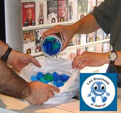 Les Bouchons d’Amour, ce sont des millions de bouchons plastiques collectés, recyclés en vue de financer l’acquisition de matériel pour handicapés (fauteuils roulants, …), et des opérations humanitaires ponctuelles. Le bigarchon de Crécy, notre ami Bruno, le patron du Cybercafé (& Location vidéo) collecte les fameux bouchons d’amour. Sur la photo c’est jna qui est vient déposer dans le pot commun une pleine boîte de bouchons. Des bouchons de toutes sortes, à dominante bleue, témoins de son mode d’alimentation. Il y a ausi un peu de vert, parce qu’à son âge, le lait au bouchon vert c’est plus facile à digérer. Comme les Brionautes, ne jetez plus vos vieux bouchons multicolores, déposez-les au cyber. Le point sur la collecte dans la suite … |