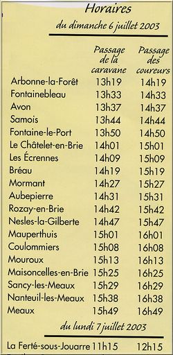 Dimanche 6 juillet, le TOUR de FRANCE traverse la Seine et Marne du sud au nord, pour faire étape à Meaux. Deux équipes, COFIDIS et TEAM TELEKOM, passeront la nuit à l’hotel du golf de Crécy dont l’entrée restera libre. Cliquez ici pour voir la carte Itinéraire de l’étape et les heures de passage dans la région |