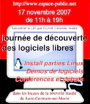 L’association @rrobe / Espace public libre, l’association Fertill et la mairie de Saint-Germain-sur-Morin organisent une journée de découverte des logiciels libres le samedi 17 novembre, de 11 heures à 19 heures dans les locaux de la nouvelle mairie.