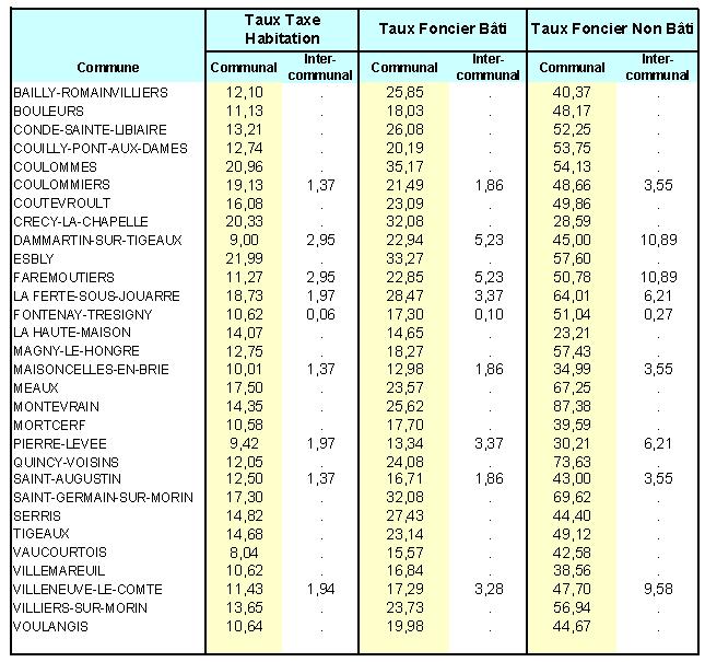 En pays créçois, le taux d’intercommunalité est nul car la communauté de communes se finance par la taxe professionnelle, impôt payé par les entreprises. Pour connaître que l’on va payer, on multiplie le taux par la valeur locative de son appartement, maison ou terrain (cas de propriété non batie). Ce qui nous intérese ici c’est surtout de comparer les taux entre les différentes communes. Pour consulter l’ensemble des résultats de seine-et-marne : (sources : portail fiscal http://www.impots.gouv.fr/ ) |