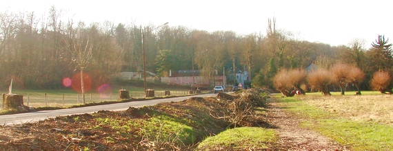 J’aperçois au loin de l’eau qui brille, la glace du petit matin a fondu et malgré un savant détour, j’en serai quitte pour un bain de pieds glacé ! « Les baskets çà sèche et avec le bon rythme que j’ai , mes pieds seront vite secs » me dis en entendant le chant des oiseaux, malheureusement parfois couvert par le bruit de la circulation sur la RN 34 , pardon de la RD 934 … je m’y ferais jamais ! Et tout d’un coup, c’est l’apocalypse… Même si je le savais, la vision qui s’offre à moi me glace le sang (c’est bien le moment ), j’ai soudain l’impression de piétiner des cadavres de me retrouver dans un cimetière d’arbres ! |