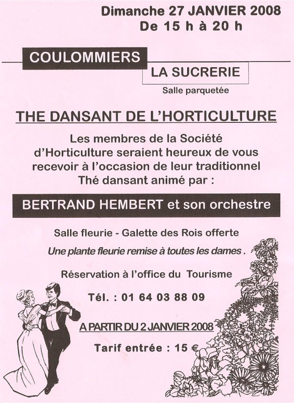 Le président de la Société d’Horticulture de Coulommiers, Roger Benoist, invite les gens de la région à venir danser à la Sucrerie en ce début d’année. C’est le dimanche 27 janvier de 15h à 20h. Réservation obligatoire au 01.64.03.68.09. Entrée : 15 euros