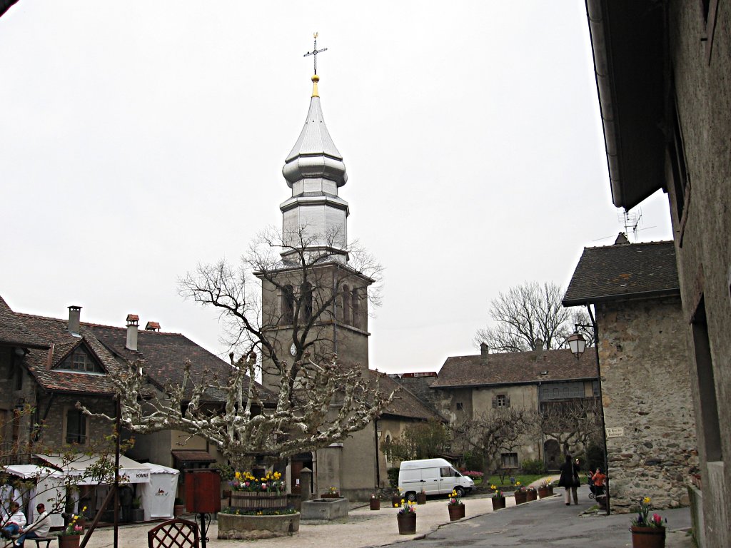 Yvoire est un village médiéval mais c’est aussi la presqu’île du Leman. Yvoire a conservé une partie de ses remparts, dont deux portes percées dans les tours. C’est en flânant dans ses rues étroites que l’on découvre de ravissantes maisons fleuries ainse que sa place du Thay. Juste à côté son église St Pancrace. Son clocher a été rénové en 1989 avec des écailles en acier inoxydable et des feuilles d’or.