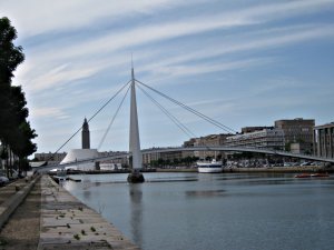 Le Bassin du Commerce, le bâtiment blanc en arrière-plan est le Centre culturel Niemeyer, du nom de l’architecte brésilien qui l’a conçu, et, dans le fond, se trouve la tour de l’Eglise Saint Joseph