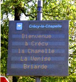 Mardi soir, il m’est arrivé une aventure extraordinaire, j’ai voyagé dans le temps. Je n’aurais pourtant jamais dû quitter le bus SNCF qui me ramenait d’Esbly à Crécy vers 20H00. Comme cela m’arrive assez souvent, je me suis assoupi dans l’autocar sous l’effet conjugué d’une dose d’EPO et d’une saine fatigue provoquée par une longue journée de labeur. C’est un symptôme caractéristique de l’aliénation par le travail, mais il faut bien s’en accomoder vu que l’on va devoir travailler plus, pour restituer nos RTT. Donc, en arrivant à Crécy, le bus prit la rue de l’Intermarché pour buter sur le stop, situé à la hauteur du champ de foire et du panneau d’information lumineux (Cf. photo). L’arrêt, un peu brusque, de l’autocar me réveilla en sursaut. Sortant d’une espèce de torpeur, mon premier regard hagard fut pour LE panneau d’information lumineux qui, ce soir-là, n’affichait pas "Mémoire vide". Stupeur, à la lecture des messages: on nous informe de la tenue d’une exposition à la Maison du Tourisme, Ustensiles Ménagers du 27/02/08 au 13/04/08 !
