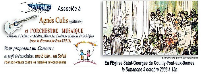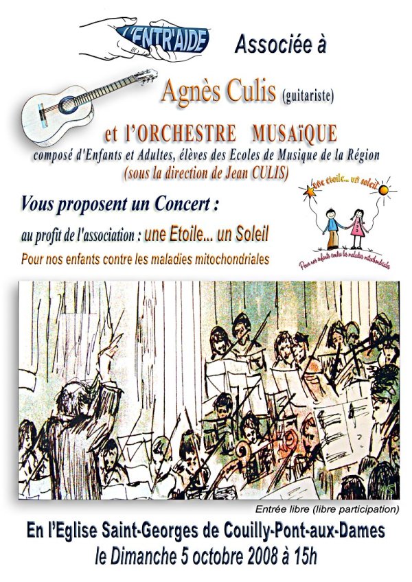 Dimanche 5 octobre, à 15 heures, en l’église Saint-Georges de Couilly-Pont-aux-Dames, l’association L’ENTR’AIDE associée à la guitariste Agnès CULIS et à l’orchestre MUSAIQUE, vous proposent un concert au profit de l’association « une ETOILE…. un SOLEIL », structure qui vient en aide aux parents d’enfants touchés par les maladies mitochondriales.