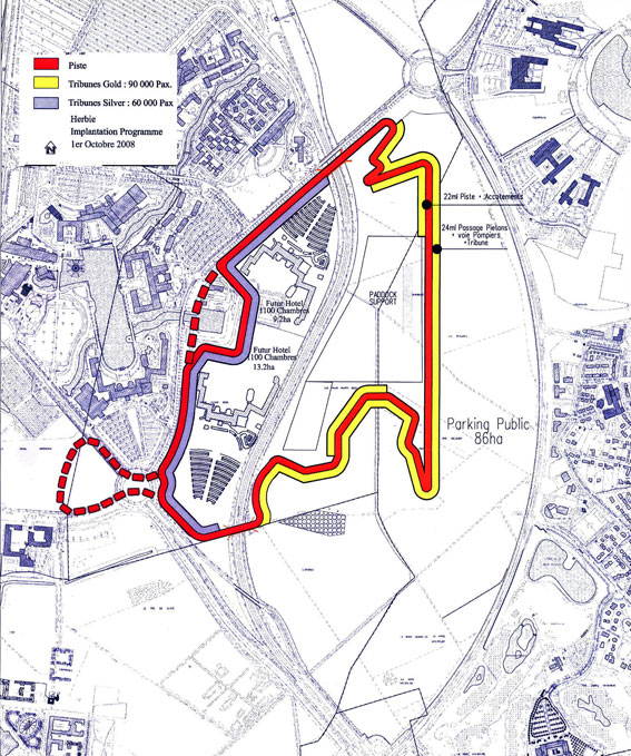 Qaund je regarde le plan, il semble néanmoins qu’une grande partie du circuit serait située dans les champs innoccupés actuellement entre le boulevard circulaire (côté Magny) et l’autoroute donnant accès au Parking du Parc. Il y aurait une piste, les paddocks et des tribunes. Je suppose que les installations à cet endroit ne seraient pas amovibles mais permanentes. Quelque part ce serait du gâchis de n’utiliser ces installations qu’une fois par an ! Aves une petite piste complémentaire, longeant l’autoroute, il y aurait de quoi faire un beau circuit de Formules …inférieures, et zou, ça marcherait toute l’année !