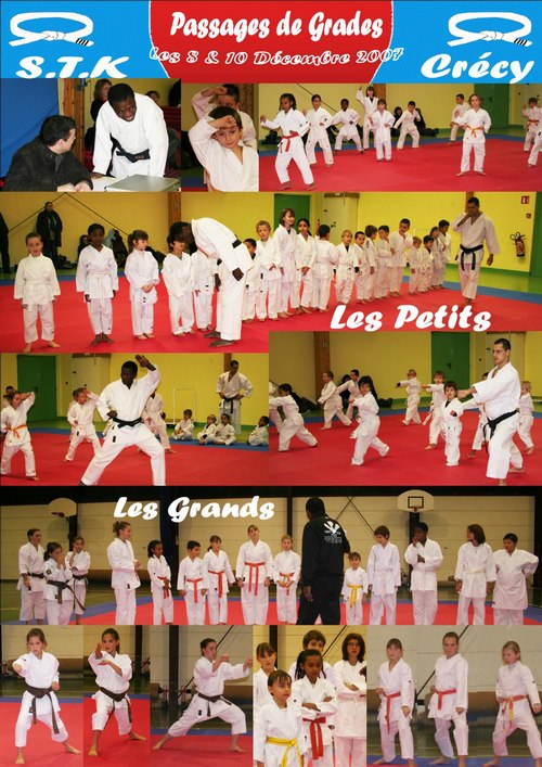 Les karatékas portent une ceinture dont la couleur change avec le grade. La ceinture noire s’obtient après neuf kyus. Après avoir obtenu sa ceinture noire, le karatéka pourra ensuite poursuivre son évolution en passant des Dans. Mais les étapes entre les Dans sont beaucoup plus longues que celles qui séparent les ceintures de couleurs. Rares sont ceux et celles qui atteignent le niveau de 10 ième Dan; ce sont habituellement les précurseurs d’un style, ou les disciples des Maîtres. Les kyus se comptent à rebours. Ainsi le 9ième kyu est la ceinture blanche, le 8ième la ceinture jaune et ainsi de suite. Le 1er kyu est le stade précédant la ceinture noire, 1er Dan ou Shodan. Les couleurs des ceintures peuvent varier d’un dojo à l’autre, mais l’ordre habituel de blanche à noire est : blanche, jaune, orange, verte, bleue 1 et 2, marron 1,2 et 3. Par la suite, les niveaux suivants se nomment des dans.