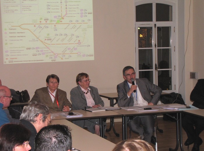 L’écomobilité à St Germain. Un conseiller municipal de St Germain présent à cette réunion, a insisté sur la nécessité de revoir les horaires des navettes, en particulier en soirée, au-delà de 18H30. Il a raison. Il a également évoqué le concept d’écomobilité dévellopé dans sa commune. On ne sait pas exactement ce qui se cache derrière ce terme flatteur. La municipalité souhaiterait que la mise en place du tram-train s’accompagne de la création d’une halte supplémentaire à St Germain au niveau de l’école et à proximité de la Résidence du Grand Morin. Cela reviendrait au passage, à reperdre le temps qui pourrait être gagné par ailleurs. Eole, priorité à la jonction avec l’ouest parisien. Alors quelques élus présents dans la salle s’inquiétaient du prolongement d’Eole jusqu’à Meaux, M. TESTU a rappelé sur les priorités de la Région et de la SNCF sur cette partie du réseau (cf. le le SDRIF). L’objectif prioritaire est de relier la partie est du réseau, à la ligne SNCF qui de St-Lazare va jusqu’à la Défense. Il faut encore creuser depuis la gare d’Haussmann, jusqu’au-delà de la gare St Lazare pour ressortir sur la ligne existante en direction de la Défense. Un projet gigantesque. Une fois ces travaux achevés, nous disposerons d’une seconde tranversale est-ouest, indispensable au désengorgement du RER A. Des élus présents et des élus absents. Il y avait visiblement dans la salle plusieurs élus représentant des communes de la région et de notre vallée en particulier (comme Esbly ou Saint Germain). Je regretterai au passage l’absence de représentants de Crécy. Cela me fait penser, qu’il n’y a priori chez nous (en tout cas ce n’est écrit nulle part) plus aucun adjoint dédié à la question des transports en commun, hormi les transports scolaires. Plus personne pour prendre en charge les questions quotidiennes (exemple : le cas des cars desservant les lycées de Meaux) comme le faisait avec efficacité, Corinne Thioux, sous le précédent mandat. jna |