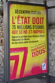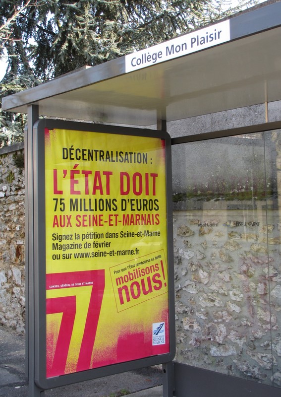 L’Etat quant à lui considère qu’il ne doit rien, surtout à un département dont le conseil général penche légèrement à gauche, mais à gauche quand même. Dans ce conflit entre une collectivité territoriale et l’Etat, le pot de terre contre le pot de fer, les élus locaux de droite ne font pas preuve d’esprit de clocher. Il soutiennent l’Etat, avec parfois quelques état d’âmes, mais pour le coup l’important c’est la solidarité avec le Président Sarkozy, l’Etat c’est presque lui. Pour ces Seine-et-Marnais, l’Etat ne doit rien au département. Cette soi-disant dette est dénoncée comme une manœuvre du Président du Conseil Général visant à dissimuler la mauvaise gestion des affaires du département. Les mêmes élus, d’ajouter que cette campagne de communication est une preuve supplémentaires de la mauvaise utilisation des fonds du contribuable. Pour finir, il semble que cette démarche ait peu de chance d’aboutir. L’Etat a déjà distribué beaucoup d’argent aux plus nécessiteux et c’est le moment précis que choisit la commission de Bruxelles pour, à nouveau, pointer du doigt le déficit budgétaire du Pays. Ca tombe mal. jna ![]() une des affiches visibles devant le Collège |