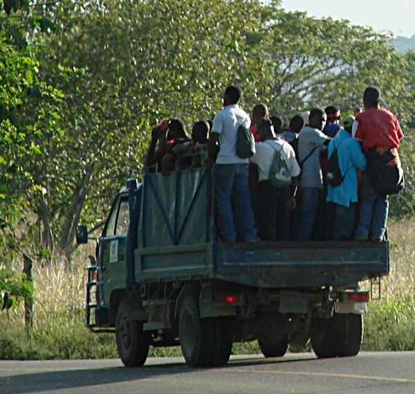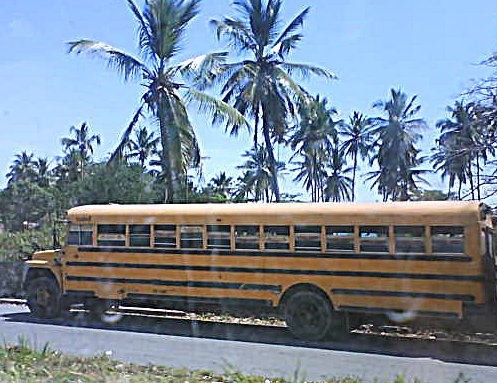 Ce bus qui ressemble étrangement aux bus US est le témoin de l’américanisation du pays. Les américains ont vendu aux dominicains jean’s, tee-shirt et même 4×4 à profusion, y compris dans les coins les plus reculés et les plus pauvres du pays. On compte en gallons et le dollar est roi, rattrapé il est vrai par l’euro qui désormais vaut plus cher ! Le base-ball est le sport national avec les combats de coqs.