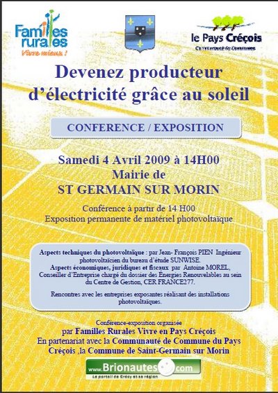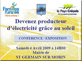 RAPPEL RAPPEL RAPPEL : Vous êtes tous cordialement invités à la Conférence-exposition sur le thème de la production d’électricité d’origine photovoltaïque le Samedi 4 avril 2009 à 14h dans les locaux de la Mairie de Saint Germain sur Morin. Cette manifestation est organisée par l’association Familles Rurales Vivre en Pays Créçois, en partenariat avec la Communauté de Communes du Pays Créçois et la Mairie de Saint-Germain-sur-Morin.