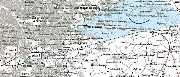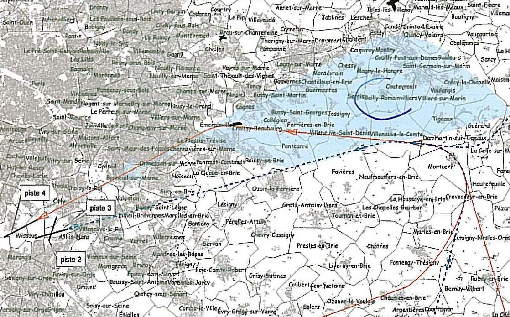 | Comme souvent, certains aménagements des pistes d’Orly vont subir une période de maintenance de la mi-mai à la mi-juillet. Les couloirs aériens sont donc modifiés en conséquence; la carte ci-jointe indique les nouveaux parcours. En fait les avions passent carrément au-dessus de Crécy. Cela apporte à l’évidence une certaine gêne mais bon comme les moteurs sont à faible puissance, ce n’est pas vraiment catastrophique. |