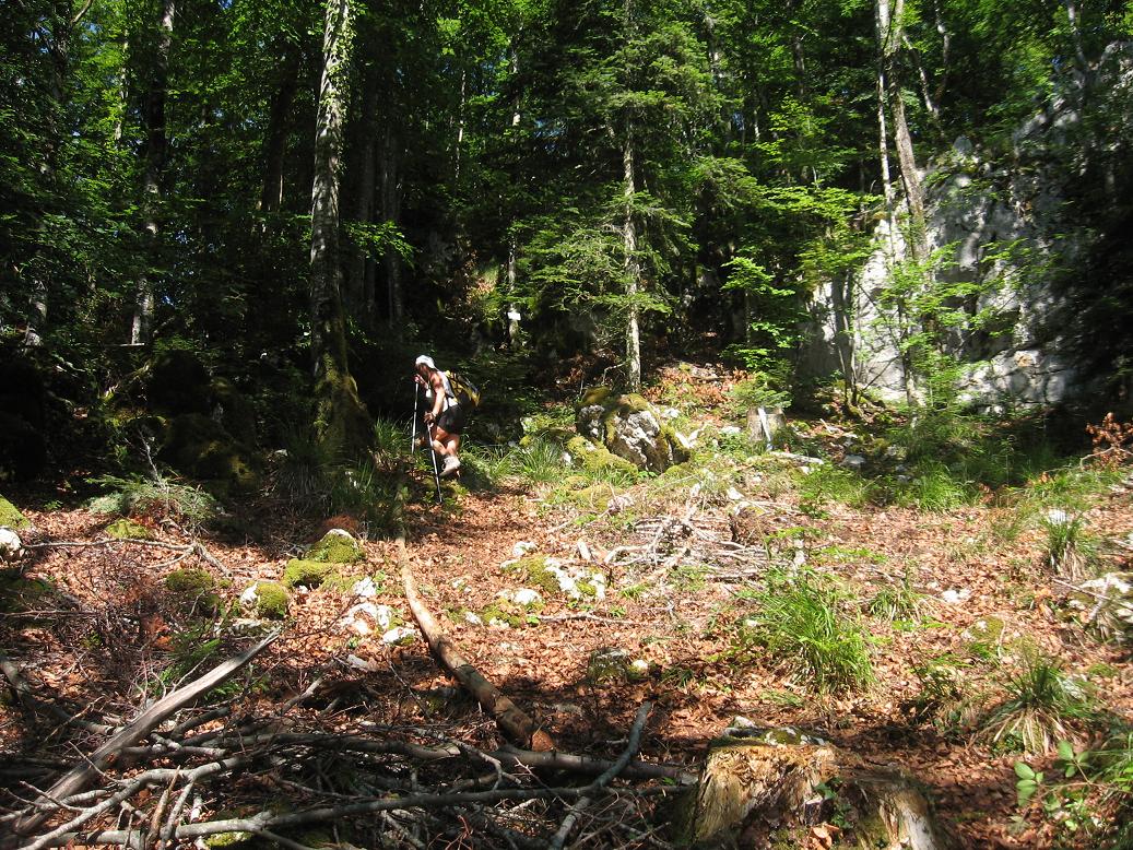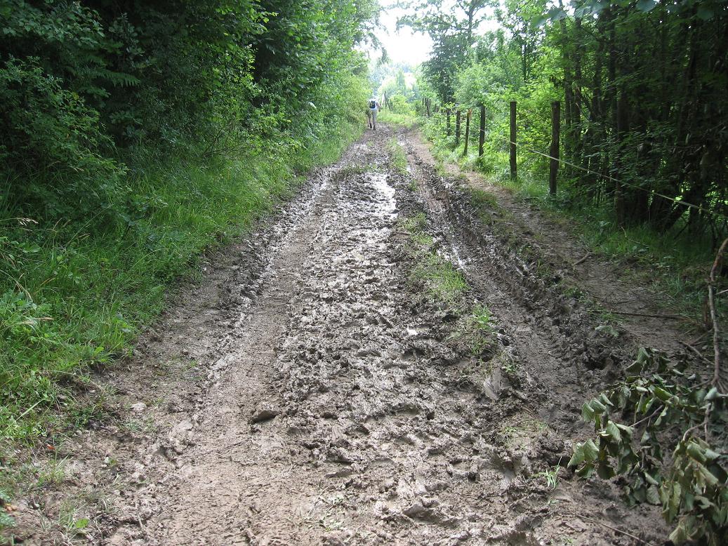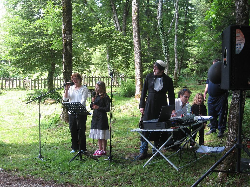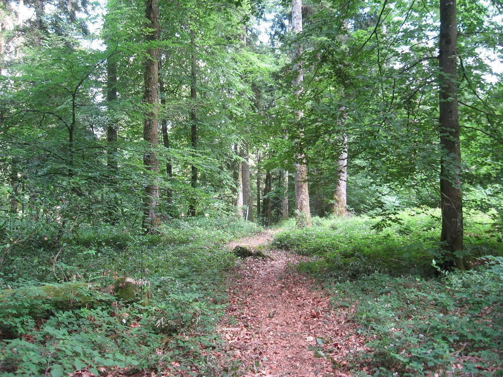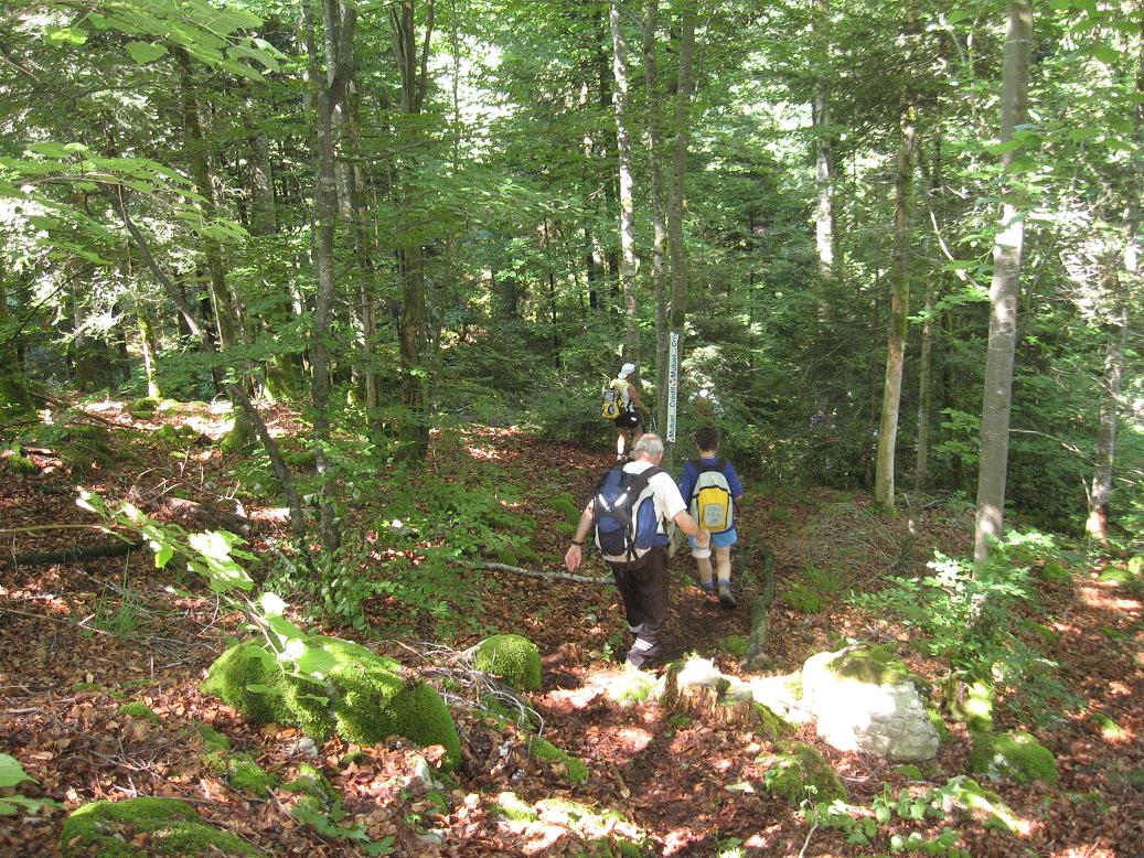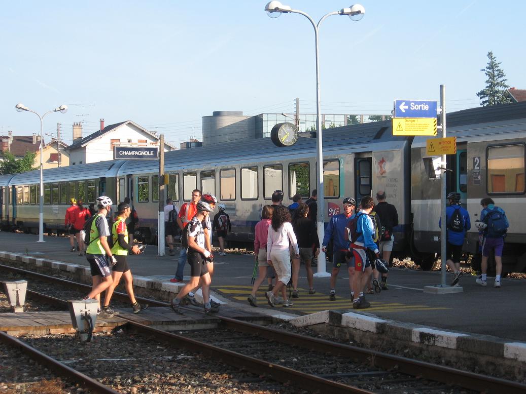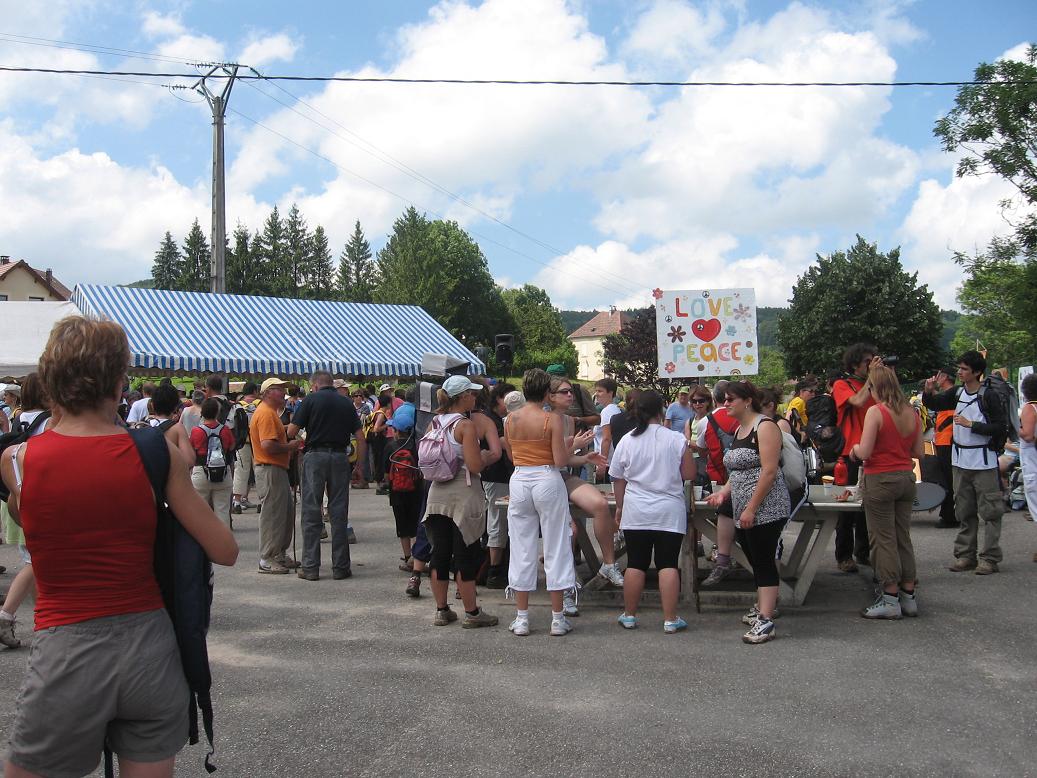 Le café est offert. Avec le haut-parleur, un organisateur nous informe que le train aura 15 minutes de retard…….. Il entre en gare, la porte s’ouvre et nous passons un par un pour la vérification des bracelets. C’est la première année que je trouve une place assise. Après 20 minutes de trajet, on descend. Et c’est parti !! Il est 8h00. Quelle foule, et ce pendant quelques temps. La première difficulté arrive, traverser une rivière sur des pierres, la foule s’éclaircit. Au milieu d’une belle montée la 1ère curiosité "la caborne à la vieille". Il fait chaud et ça grimpe. En haut nous attend un belvédère " le Lac de Narlay", c’est magnifique. C’est reparti… Vous entendez??? Ah, j’ai oublié de vous dire, mais vous êtes montés avec moi dans le train…, alors vous entendez cette musique ??? c’est le ravitaillement, serait-il tout près ? Tiens nos amis les bêtes. Ah le voilà !!! Un verre de sirop, quelques quartiers de tomates et c’est reparti. Nous passons tout près du lac que l’on a vu depuis le belvédère. Ah les bois, quelle fraîcheur, la nature, les oiseaux qui chantent … On papote de droite de gauche, tout en faisant attention où l’on met les pieds. 2ème ravitaillement, toujours avec de la musique et des nouveaux déguisements. J’en profite pour envoyer un sms à une amie qui a pris de mes nouvelles un peu plus tôt. Il est indiqué "il vous reste encore 17 kms", et ben !! Il est 11h30. Allez on y va !!! A la sortie du bois une église avec son toit francomtois. On approche donc du village appelé "Châtelneuf". Que font ces gens ??? Cette fois-ci , je ne peux pas, ne pas prendre une photo. Une fois celle-ci contournée nous quittons ce village surnommé " Versailles du Jura" eh oui…. Nous revoilà dans les bois, c’est bien là que nous sommes le mieux. Ca me rappelle quelque chose cet écriteau, pas vous? Que de monde à ce 3ème ravitaillement au village du "Vaudiou". C’est la fête!!! Faut pas refroidir nos muscles, vous me suivez ??Un km à pied ça use, ça use… et ça grimpe et ça grimpe….Tiens un autre belvédère, c’est Champagnole… Voilà que nous descendons, je préfère finalement quand ça monte. 4ème ravitaillement et le dernier, celui-ci est dans les bios. Un banc, je m’y assois. Je commence à être fatiguée, pas physiquement mais mentalement. Et vous ? Il reste 6 kms, dernière ligne droite, allez du courage. et encore une photo… Un village "Ney", prenez une photo si vous voulez, moi, je n’en peux plus. BRAVO vous venez de parcourir avec moi 31 kms, initialement prévu 28 !!! |