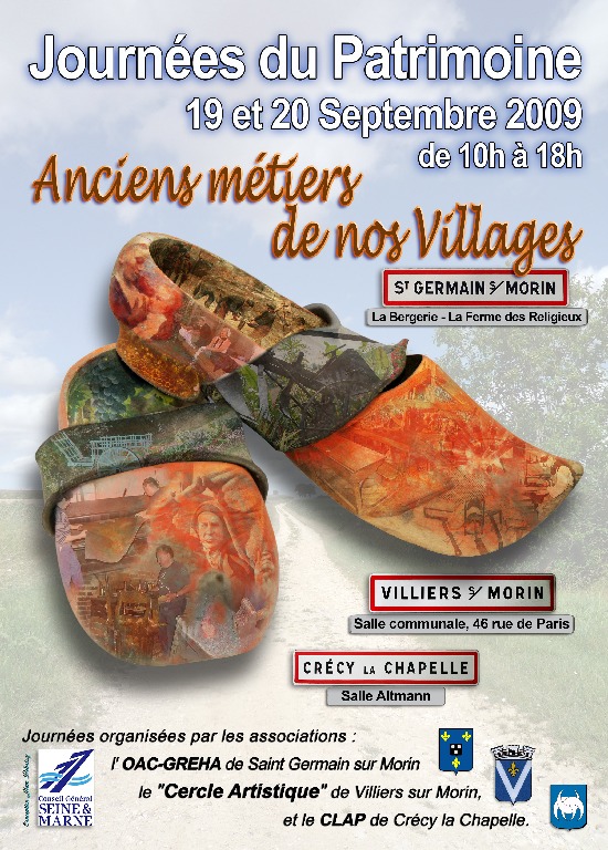 Devant le succès rencontré lors des « Journées du Patrimoine 2008 », sur le thème « Nos Moulins », le CERCLE ARTISTIQUE de Villiers-sur-Morin, le CLAP de Crécy-La-Chapelle et l’OAC-GREHA de Saint-Germain-sur-Morin ont décidé, pour les « Journées du Patrimoine 2009 » de reconduire leur collaboration.