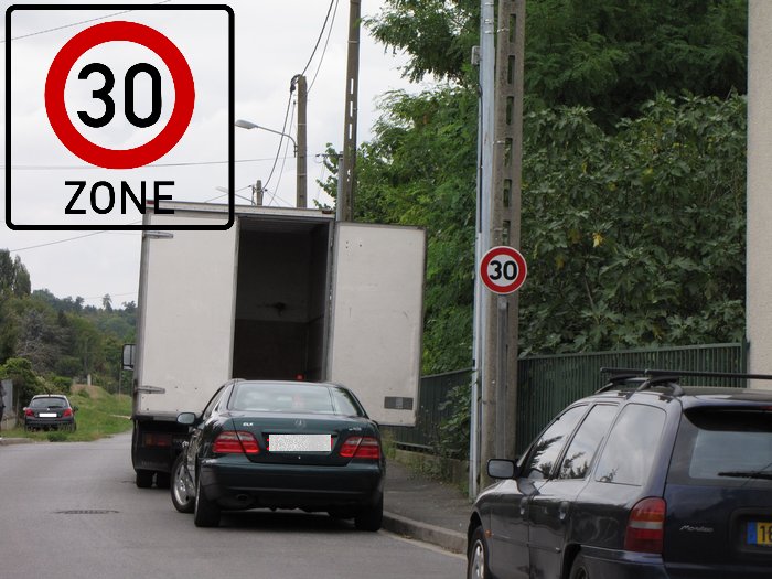 Bien sûr, il suffirait que les voitures ralentissent quand elles s’apprêtent à doubler ou croiser des piétons et l’affaire serait réglée. J’imagine qu’il n’en est malheureusement pas toujours ainsi. C’est, je suppose (mais ce n’est pas confirmé), la raison pour laquelle la rue a été classée en zone 30, au nom du principe de précaution.