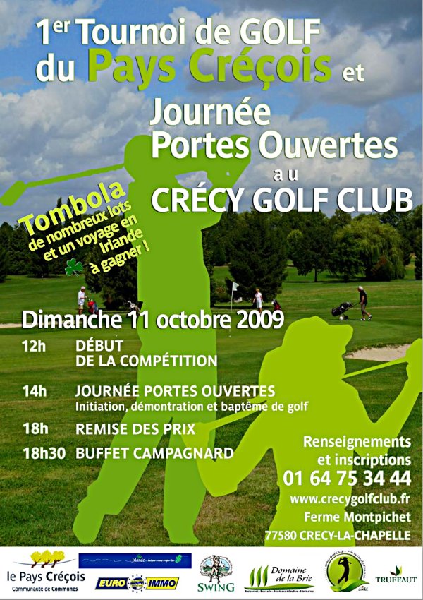 Journée Portes Ouvertes du Crécy-Golf-Club et TOURNOI DE GOLF DU PAYS CRECOIS La Communauté de Communes du Pays Créçois et le Crécy Golf Club organisent le premier TOURNOI DE GOLF DU PAYS CRéçois le dimanche 11 octobre 2009. Vous êtes totalement débutant ? Venez découvrir ce sport ! Le golf organise sa Journée Portes Ouvertes à partir de 14h, avec visite du domaine et découverte de son entretien, ateliers d’initiation par la Conor Young Academy avec prêt de matériel, baptême du golf. Vous êtes golfeur confirmé ?? Venez mettre à l’épreuve votre habileté, en participant à la compétition, dès 12h, dans le cadre exceptionnel du parcours Vignoly, signé par Arnold Palmer, et le très beau parcours de Montpichet. Peut-être repartirez-vous avec l’un des nombreux prix fournis par le sponsor, la société irlandaise SWING. Lors de cette journée, des tarifs préférentiels pour les inscriptions vous seront proposés, et un voyage en Irlande sera à gagner lors de la tombola pour tous les participants. |