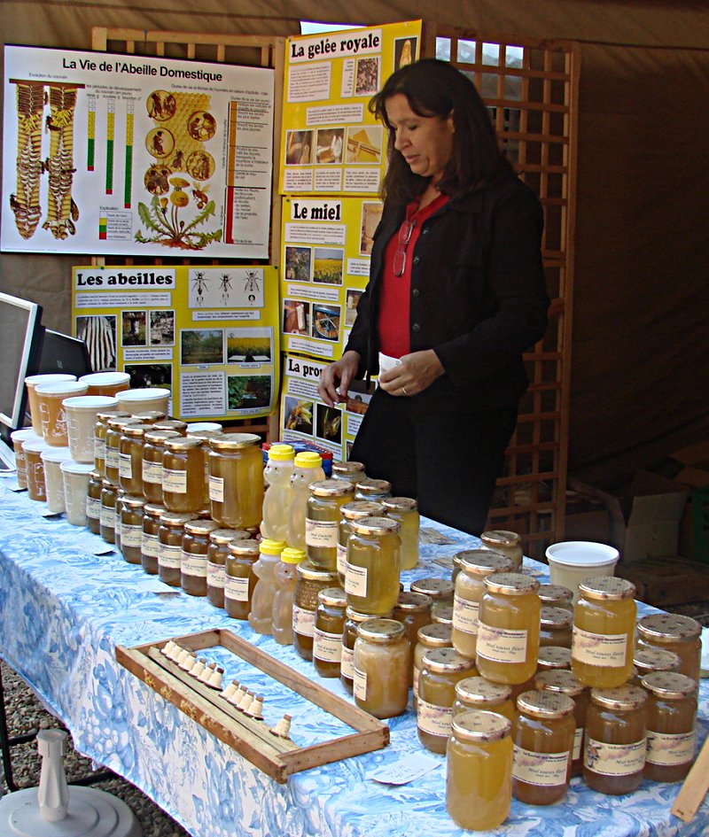 Madame l’apicultrice propose sa production appêtissante. L’énergie des abeilles, renouvelable à l’infini, tant qu’il y aura des abeilles sur cette terre, il y aura de la vie !