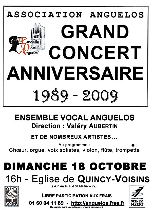 CONCERT EXCEPTIONNEL20 ans de l’orgue de Quincy-Voisins et de l’Association Anguélos (1989 – 2009)LE 18 OCTOBRE 2009 A 16H EGLISE DE QUINCY-VOISINS Pour ce jour bien particulier, l’Association ANGUELOS a invité plus d’une dizaine de musiciens talentueux, seine-et-marnais ou parisiens, pour fêter avec l’Ensemble Vocal ANGUELOS cet anniversaire. L’orgue sera évidemment à l’honneur sous les doigts de six organistes : Michèle GUYARD, concertiste renommée, Eric LEBRUN, titulaire des grandes orgue de Saint-Antoine des Quinze-Vingts à Paris, Président d’honneur de l’Association ANGUELOS et son épouse, Marie-Ange LEURENT, titulaire des orgues de Notre-Dame de Lorette, Pierre GILBERT, Olivier d’ORMESSON et Valéry AUBERTIN. Des instrumentistes ayant participé aux concerts d’ANGUELOS ces dernières années seront là également : Catherine TANKOVIC, pianiste et accompagnatrice de l’Ensemble Vocal, s’improvisera organiste pour l’occasion, Hubert DE VILLELLE, (flûte, soliste à l’Orchestre National de France), Jean-Marc VILA (trompette), Richard BLANCHET (trombone) et Antonin REY (violon). |