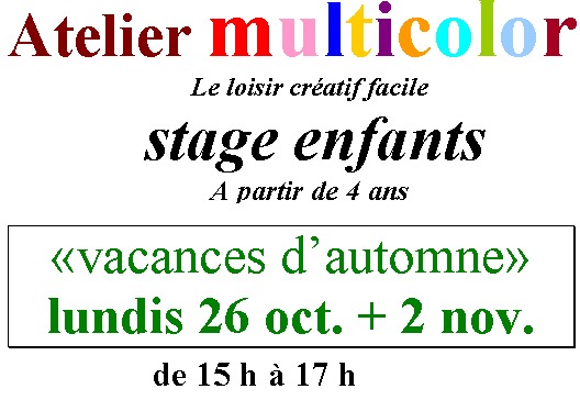 Section de « Cultures et Loisirs de Crécy la Chapelle » – Association loi 1901L’atelier multicolor propose des stages enfants les lundis 26 octobre et 2 novembre de 15h à 17 hParticipation aux frais: 10€ l’atelier Adhésion annuelle à Culture & Loisirs : 10€ par famille à partir du 2ème atelier. (valable pour les autres sections de l’association: Yoga/bibliothèque/photo/randonnée) |