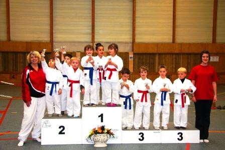 Moment phare de la compétition et instant émouvant pour les parents, les enfants du baby karaté montent sur le podium sous les applaudissements de tous, accompagnés de Jocelyne GAVOILLE, leur entraîneur et de son assistante Claire CARON.