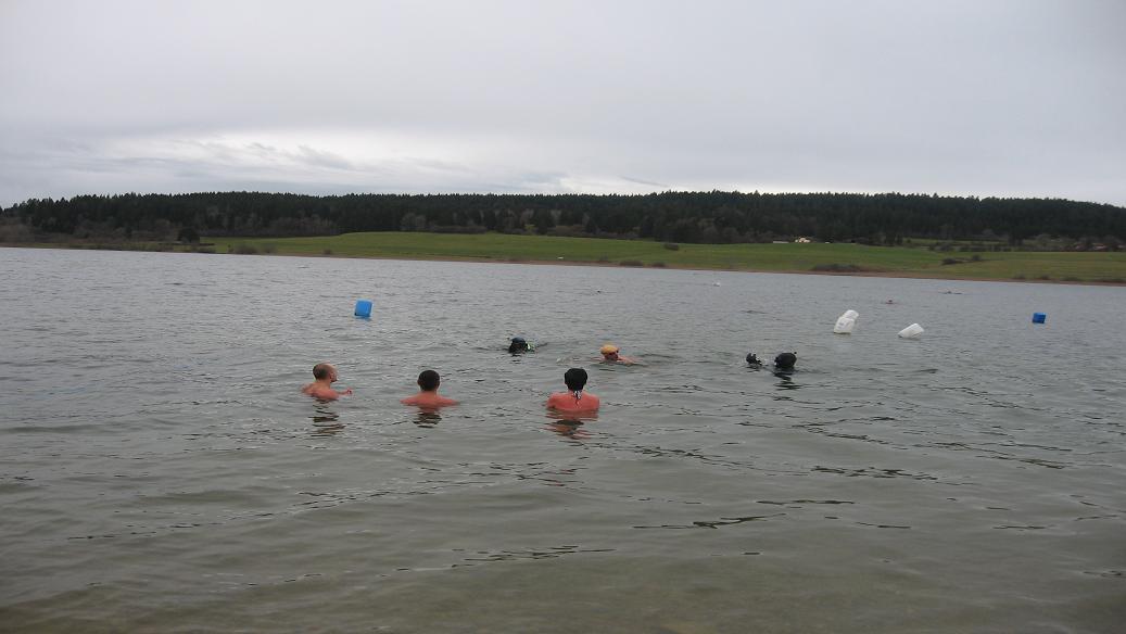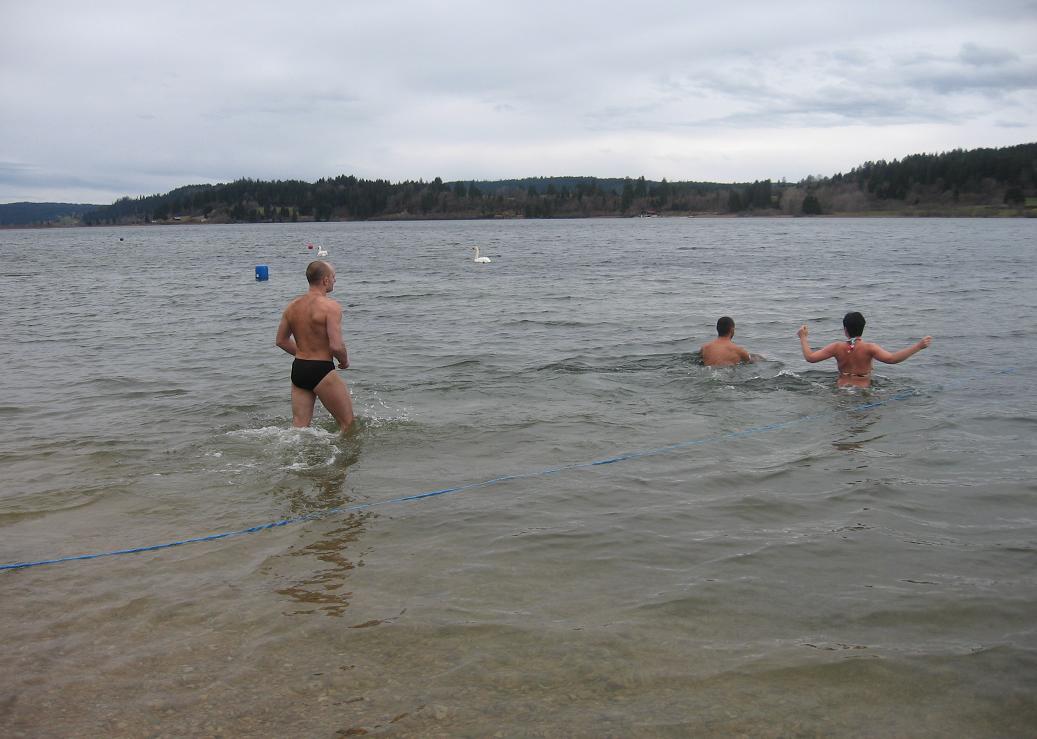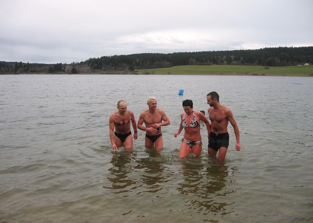 Pour la 10ème année consécutive, Christophe Corne a traversé le lac Saint-Point, d’une longueur d’environ 1000 mètres, d’une température de 6°C et de 7 à l’air. Cette journée a pris une autre dimension. En effet trois personnes s’étaient lancé le défi d’attendre le nageur en immersion statique. Après 17 min. dans ces eaux glacées, défi réussi !!! Ils étaient tous les quatre vêtus que d’un simple maillot de bain.