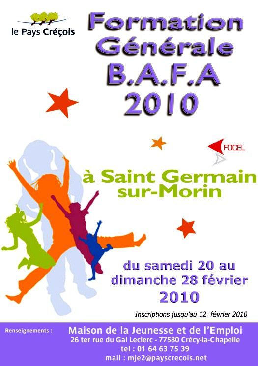 Ce brevet est nécessaire pour encadrer, de façon occasionnelle, des mineurs dans des séjours de vacances, des classes de découvertes, ou pour l’accueil péri-scolaire. Cette formation s’adresse à tous. Il faut avoir 17 ans révolus au premier jour du stage. Elle aura lieu du samedi 20 au dimanche 28 février inclus à ST GERMAIN-SUR-MORIN. Son coût est de 200 € pour les habitants du Pays Créçois, et 400 € hors Communauté de Communes. Les inscriptions seront prises jusqu’au 12 février 2010. |