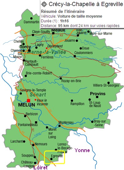 Ceci dit pour aller de Crécy à Egreville, il faut à mon avis prévoir entre 1 h30 et 2 heures, je connais un peu ce coin là , j’y ai passé le début de ma carrière tout habitant à Crécy. Il m’arrive de retourner dans cette région Mardi dernier, je suis allé à Villemer rendre visite à un couple d’agriculteur retraité, pas loin d’ Egreville.