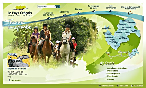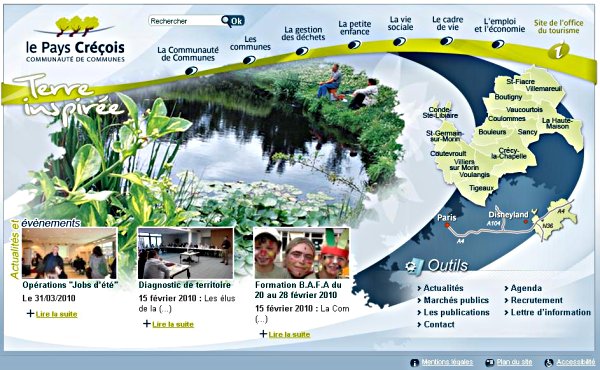 ![]() Il comporte de nombreuses informations sur la structure "communauté de communes du pays créçois" elle-même, mais aussi des rubriques pour chaque commune adhérente ainsi qu’une rubrique pour l’Office du Tourisme. Celle-ci est accessible directement au travers de l’adresse internet : http://www.ot-payscrecois.fr/.