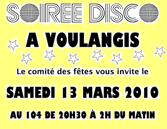 SOIREE DISCO A VOULANGISSAMEDI 13 MARS 2010 Avec vos vinyls préférés : Claude François, Boney M, Donna Summer, Village People, etc… Appelez une baby sitter, sortez vos tenues des années 70 des placards et venez danser sur les rythmes de la fièvre du samedi soir. |